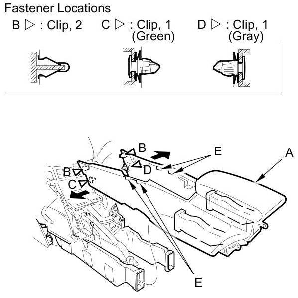 1. Detach the clips (B, C, D) by pulling the front edges of the console out from both sides.