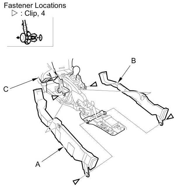5. If necessary, detach the clips, then remove the driver's rear ventilation duct (A) and the passenger's rear ventilation duct (B) from the heater unit (C).