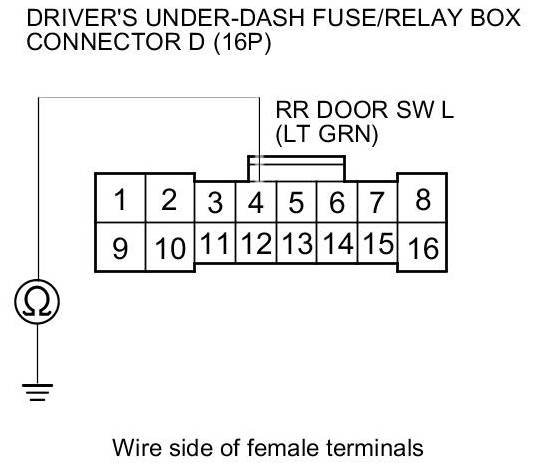 8. Check for continuity between driver's under-dash fuse/relay box connector D (16P) terminal No. 4 and body ground.