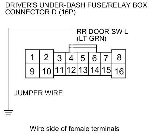 12. Connect driver's under-dash fuse/relay box connector D (16P) terminal No. 4 and body ground with a jumper wire.