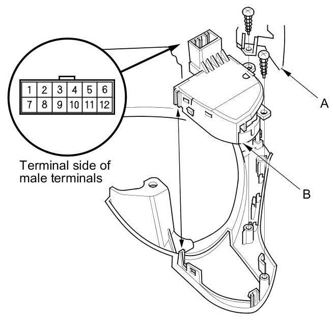 3. Remove the select/reset/information switch (A), then remove the cruise control combination switch (B).