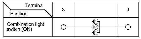 5. Check for continuity between cruise control combination switch 12P connector terminal No. 3 and No. 9 according to the table.