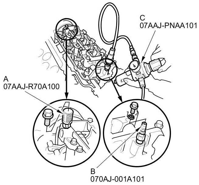 7. Remove the sealing bolts, then install VTEC air stop tool A and the VCM air adapter (B) to the inspection hole, then connect the air pressure regulator (C) as shown.