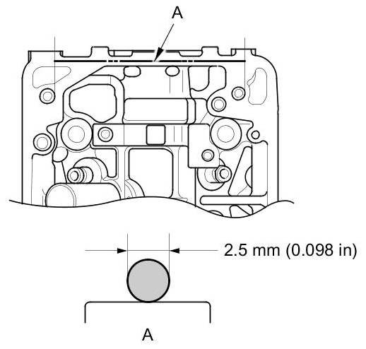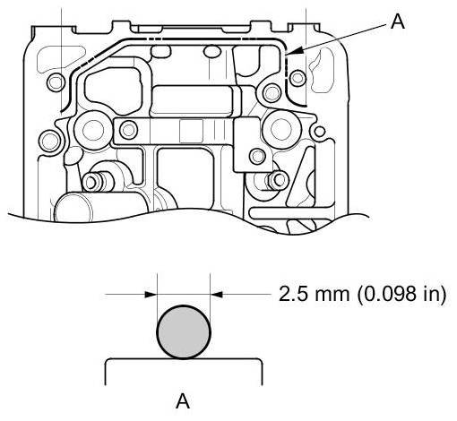 - Apply a 2.5 mm (0.098 in) diameter bead of liquid gasket along the broken line (A).