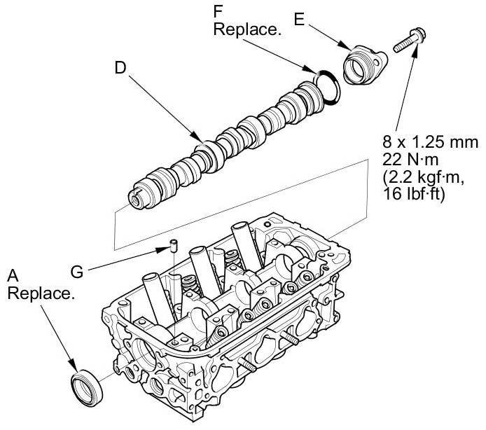 6. Insert the camshaft (D) into the cylinder head, then install the camshaft thrust cover (E). Always use a new O-ring (F). Apply new engine oil to the journals and the cam lobes.