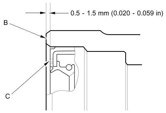 5. Measure the distance between the cylinder head surface (B) and the oil seal (C).
