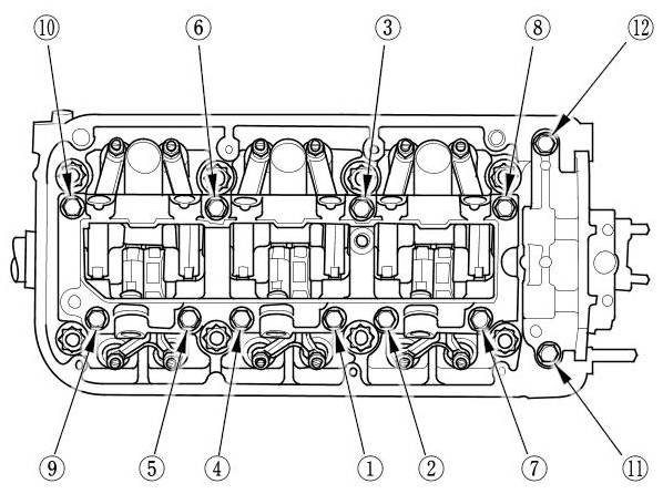 13. Tighten each bolt two turns at a time in the sequence shown to ensure that the rockers do not bind on the valves.