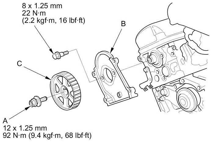 15. Apply new engine oil to the threads of the camshaft pulley mounting bolt (A). Install the back cover (B), then install the camshaft pulley (C).