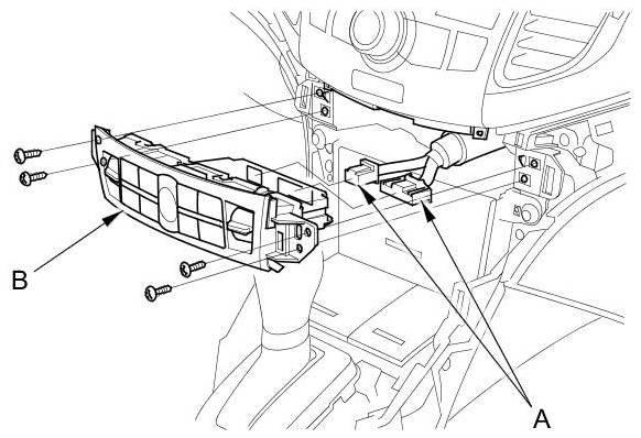 4. Remove the self-tapping screws. Disconnect the connectors (A), then remove the climate control unit (B).