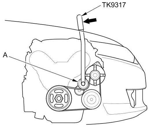 2. Move the auto-tensioner (A) using the belt tension release tool (TK9317) in the direction of the arrow to relieve tension from the drive belt, then remove the drive belt.