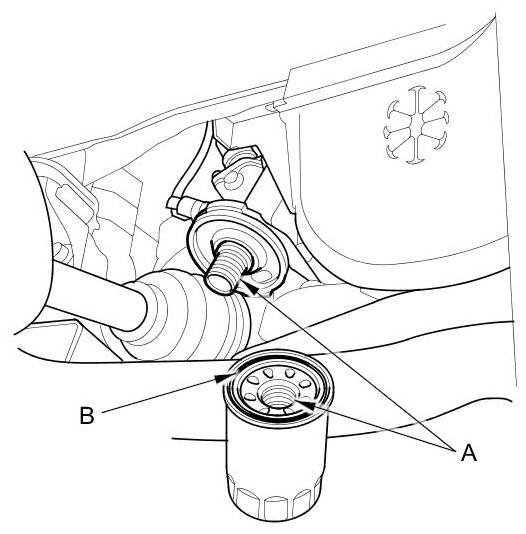 3. Inspect the threads (A) and the rubber seal (B) on the new filter. Clean the seat on the oil filter base, then apply a light coat of new engine oil to the oil filter rubber seal. Use only filters with a built-in bypass system.