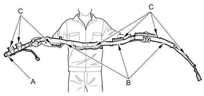- The side curtain airbag module assembly is a long, jointed part containing an inflator (A), a flexible bag (B), and brackets (C). When removing or installing the side curtain airbag assembly, never do these things:
