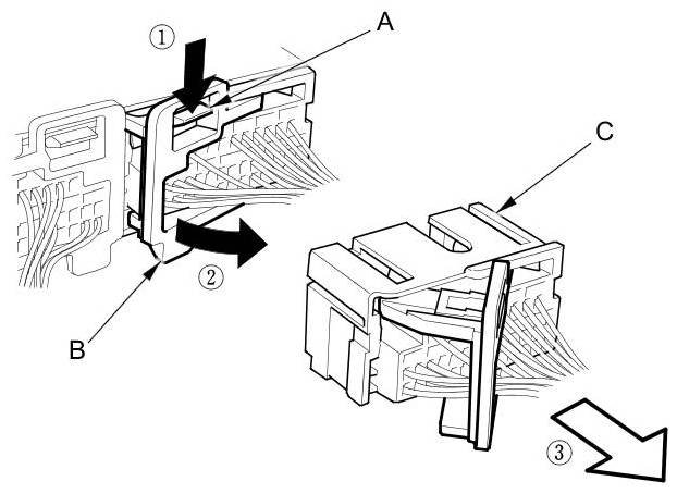 To release the lock, pull the lever (A) while pushing the lock (B), on the outside of the connector, then pull out the connector (C).