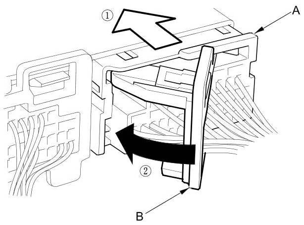 To reconnect the connector, push in on the connector (A). As the connector is pressed in, the lever (B) moves to the locked position.