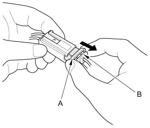 To reconnect, hold the pawl-side connector, and press on the back of the sleeve-side connector in the direction shown. As the two connector halves are pressed together, the sleeve (A) is pushed back by the pawl (B). Do not touch the sleeve.