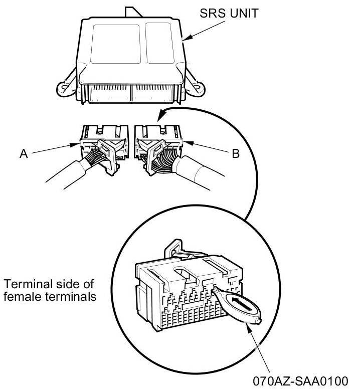 When diagnosing or troubleshooting at an SRS unit connector (A), use the terminal test port below the terminal you need to check. Gently insert the pin probes of the tester or jumper wire at the terminal test port from the terminal side.