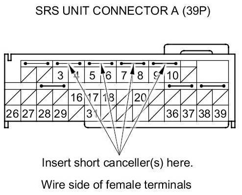 When SRS unit connectors A (39P) and B (39P) are disconnected, short circuits are automatically created in the connector to prevent accidental deployment of an airbag or tensioner. The circuit may need to be opened sometimes when diagnosing the system. Insert an SRS short canceller in the specified cavities when necessary to keep the circuit open for diagnosis.