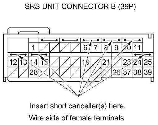 Terminal numbers are shown from the wire side of the female terminals. Insert the SRS short canceller(s) into the cavities on the terminal side of the connector.
