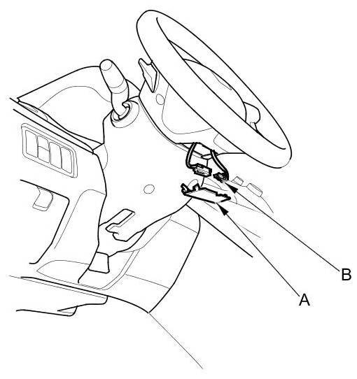 2. Remove the access panel (A) from the steering wheel, then disconnect the cable reel 4P connector (B) from the driver's airbag 4P connector.