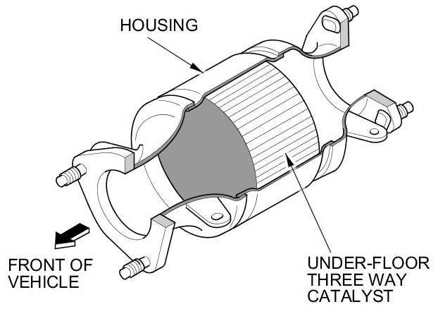 The WU-TWC/Under-Floor TWC converts hydrocarbons (HC), carbon monoxide (CO), and oxides of nitrogen (NOx) in the exhaust gas to carbon dioxide (CO2), nitrogen (N2), and water vapor.