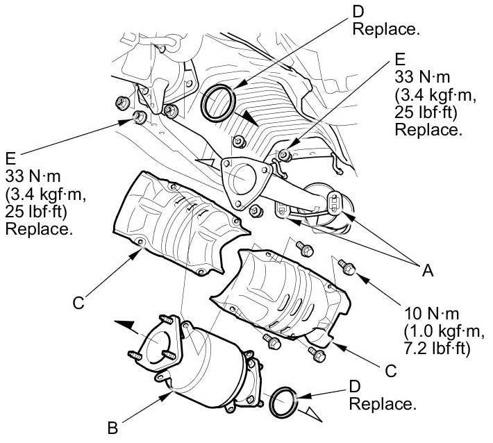 5. Install the parts in the reverse order of removal with new gaskets (D) and new self-locking nuts (E).