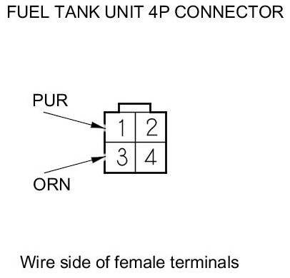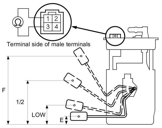 10. Measure the resistance between fuel tank unit 4P connector terminals No. 1 and No. 3 with the float at E (EMPTY), LOW (LOW FUEL INDICATOR), 1/2 (HALF FULL), and F (FULL) positions.