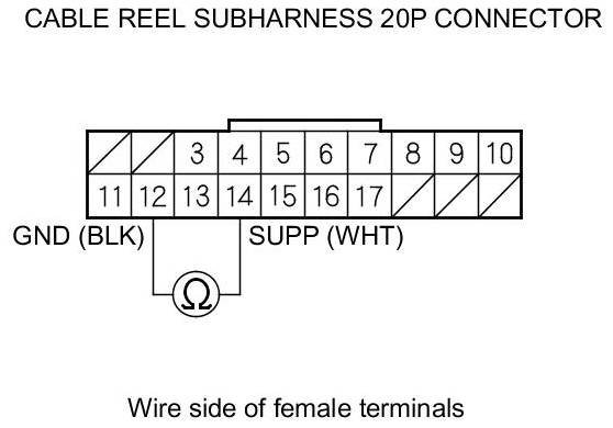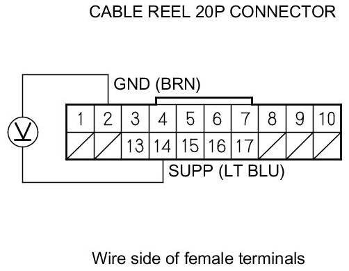 12. Measure the voltage between cable reel 20P connector terminals No. 2 and No. 14.