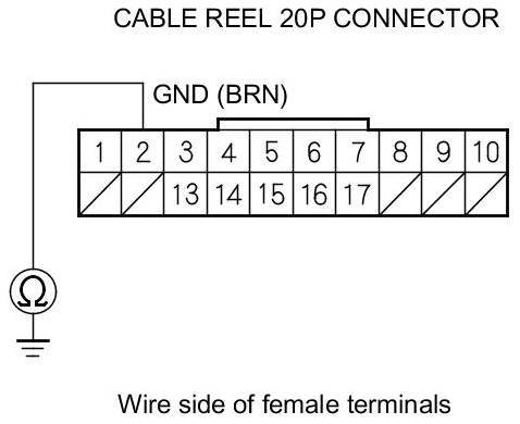 6. Check for continuity between cable reel 20P connector terminal No. 2 and body ground.