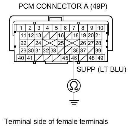 17. Check for continuity between PCM connector terminal A36 and body ground.