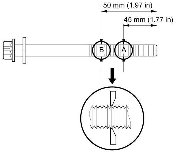 If either diameter is less than 11.3 mm (0.445 in), replace the bolt