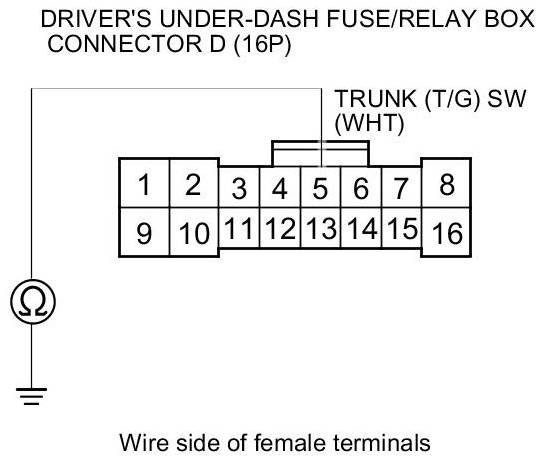 7. Check for continuity between driver's under-dash fuse/relay box connector D (16P) terminal No. 5 and body ground.