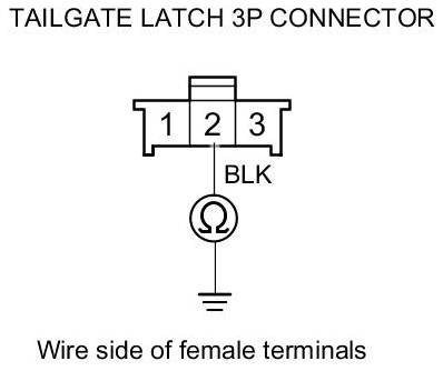 11. Check for continuity between tailgate latch 3P connector terminal No. 2 and body ground.