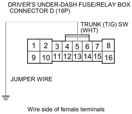12. Connect driver's under-dash fuse/relay box connector D (16P) terminal No. 5 and body ground with a jumper wire.