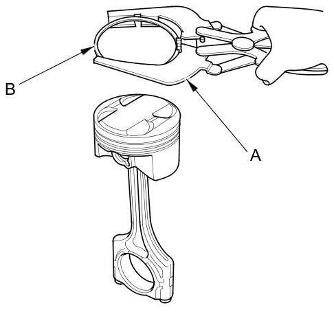 2. Using a ring expander (A), remove the old piston rings (B).