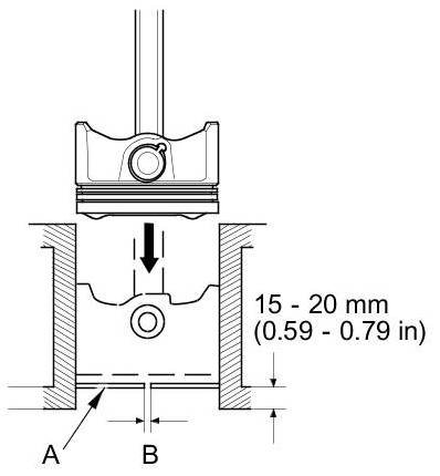 4. Using a piston that has its rings removed, push a new ring (A) into the cylinder bore 15-20 mm (0.59-0.79 in) from the bottom.