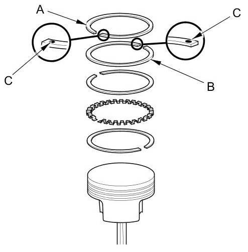 6. Install the top ring and the second ring as shown. The top ring (A) has a 1R mark, and the second ring (B) has a 2R mark. The manufacturing marks (C) must face upward.