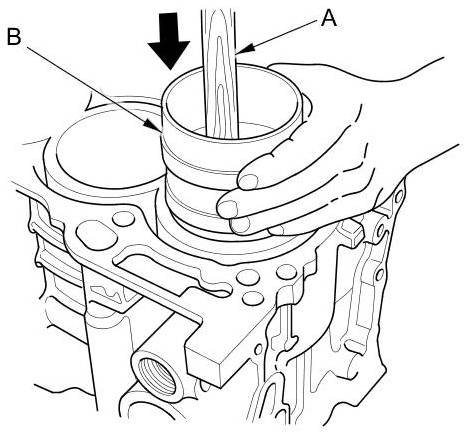 Push down on the ring compressor (B) to prevent the rings from expanding before entering the cylinder bore.