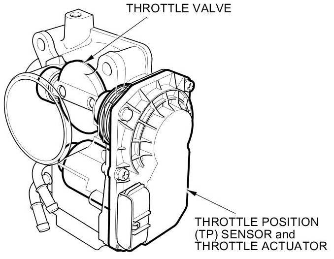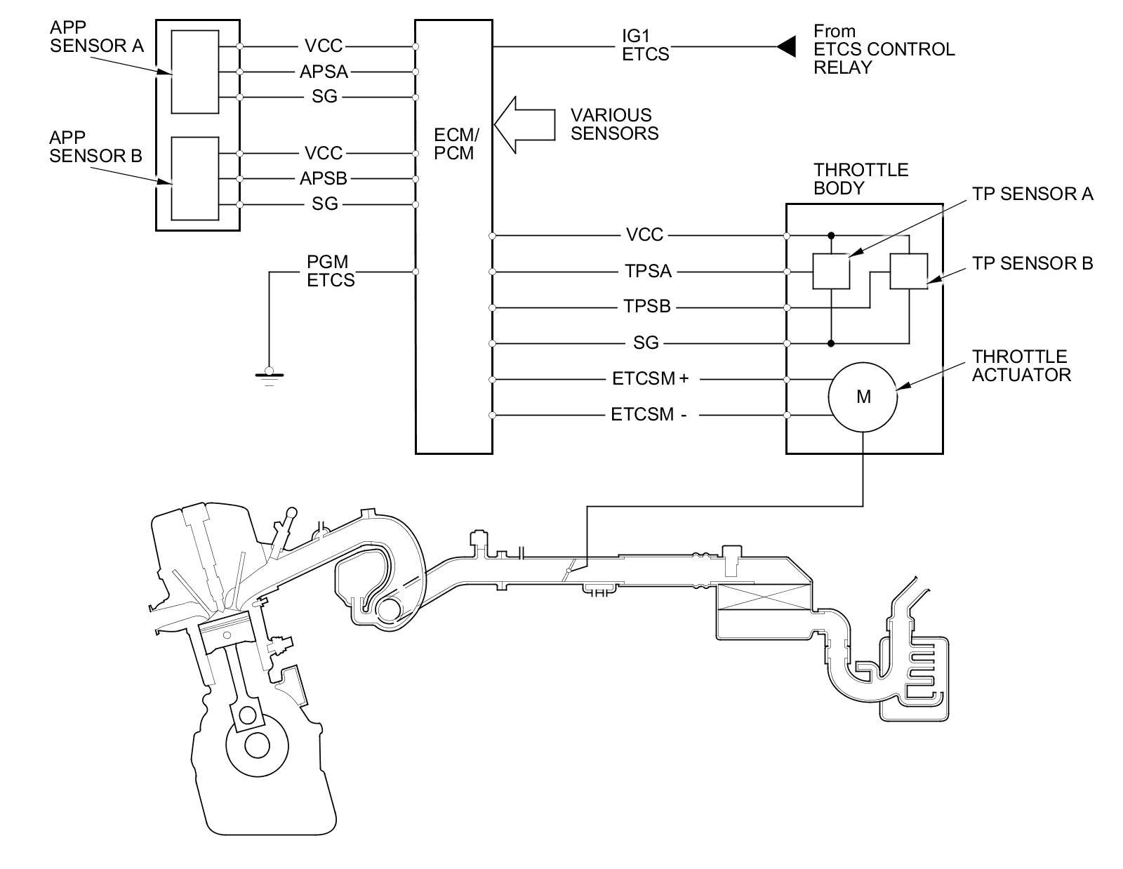 The electronic throttle control system consists of the throttle actuator, throttle position (TP) sensor A/B, accelerator pedal position (APP) sensor A/B, the electronic throttle control system (ETCS) control relay, and the ECM/PCM.
