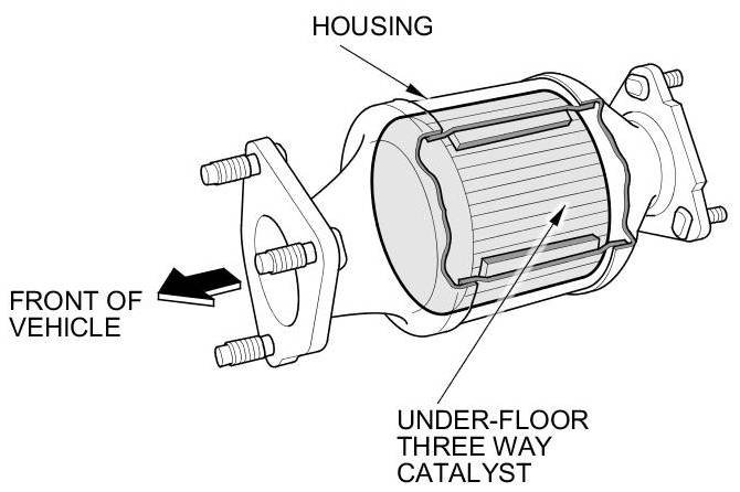 The WU-TWC/Under-Floor TWC converts hydrocarbons (HC), carbon monoxide (CO), and oxides of nitrogen (NOx) in the exhaust gas to carbon dioxide (CO2), nitrogen (N2), and water vapor.