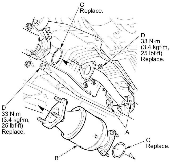 4. Install the parts in the reverse order of removal with new gaskets (C) and new self-locking nuts (D).