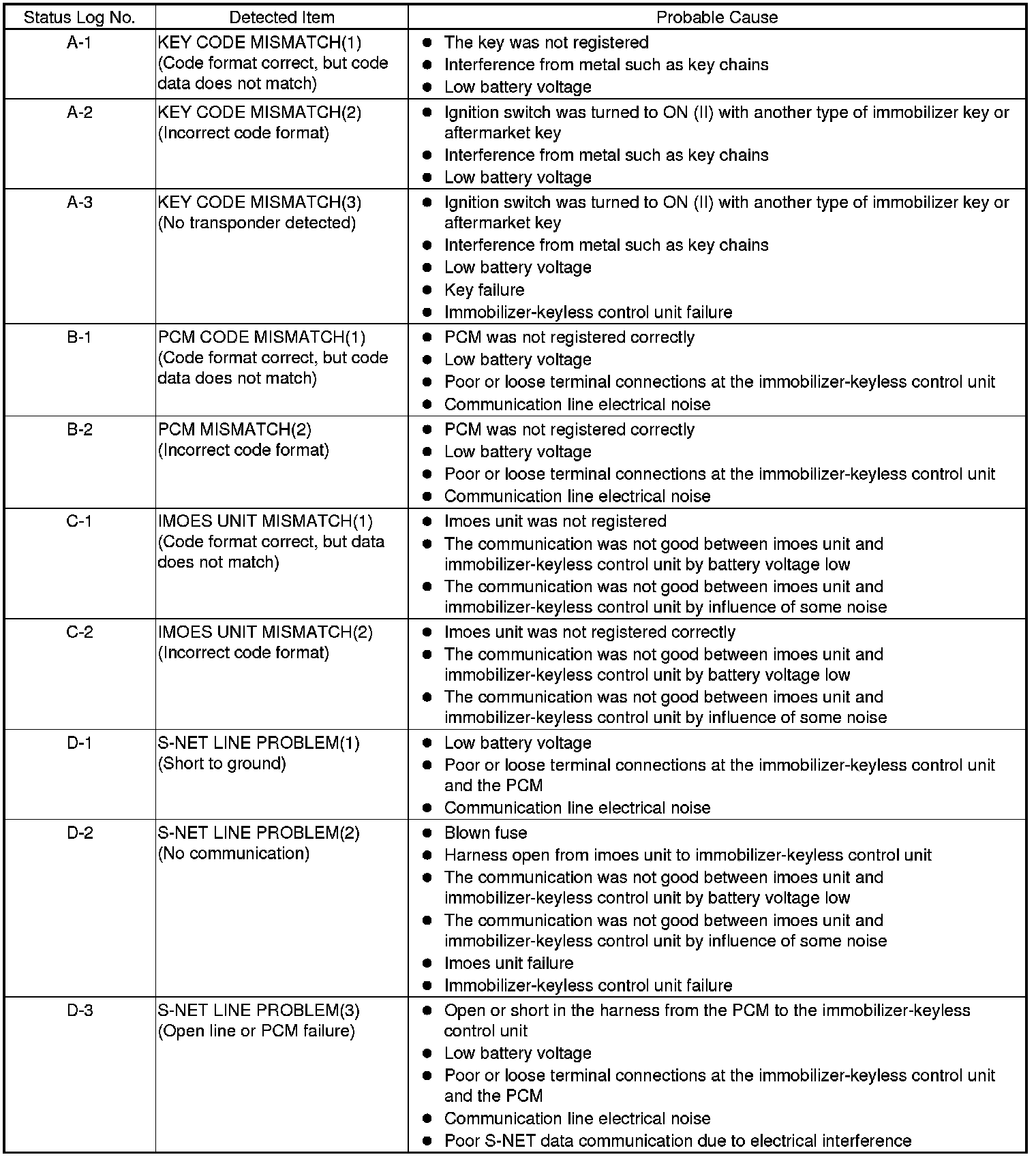 Immobilizer System Status Log