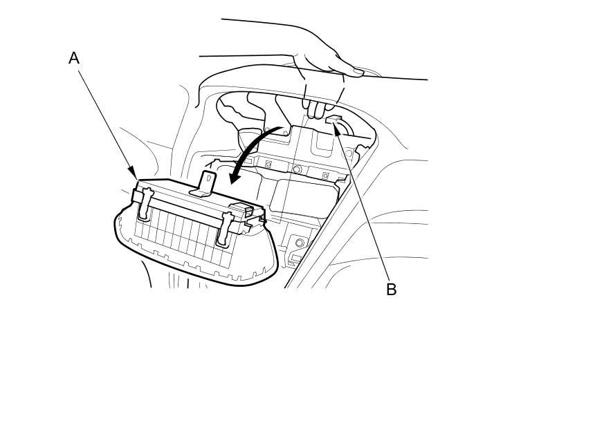 4. From the speaker hole, push out the navigation display unit (A). Then disconnect the connector (B) from the navigation display unit, and remove it.