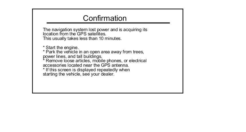 If the navigation system finds the satellites properly, the CSF screen changes to the Disclaimer screen. If within 10 minutes the system fails to locate a sufficient number of satellites to locate your position, the following screen appears.