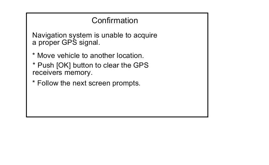 - If the system is still unable to acquire a signal, follow the instructions on the screen. If this screen appears again, go to GPS icon is white or not shown troubleshooting GPS Icon Is White Or Not Shown.