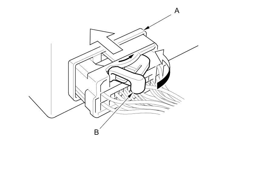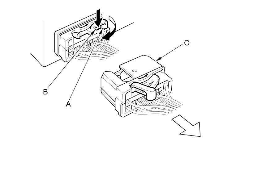 To disconnect the connector, pull the lever (A) while pushing the lock tab (B) down, then pull the connector (C).