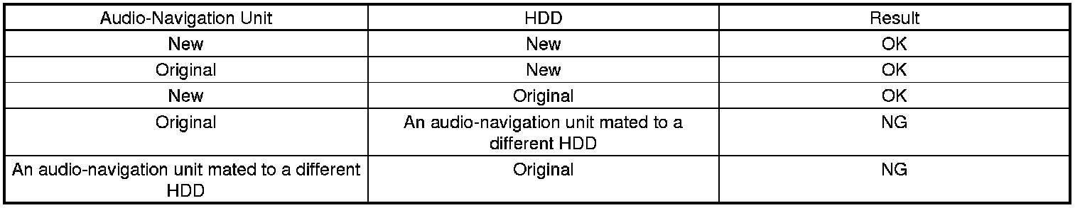 For more information, refer to Audio-Navigation Unit and HDD Service Precautions. The outline of the audio-navigation unit and the HDD replacement and substitution is shown in the following table.