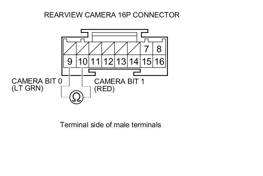 8. Check for continuity between body ground and rearview camera 16P connector terminals No. 9 and No. 10 individually.