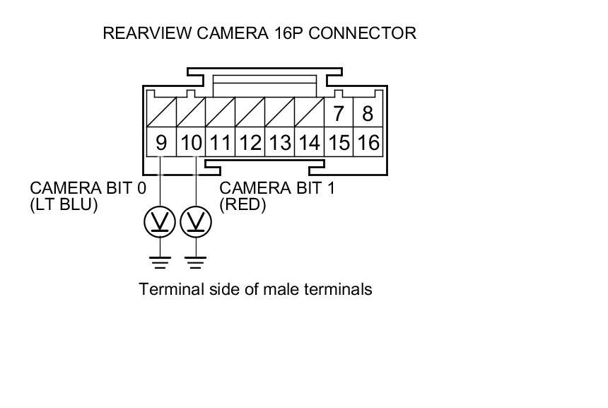 11. Measure the voltage between body ground and rearview camera 16P connector terminals No. 9 and No. 10 individually.
