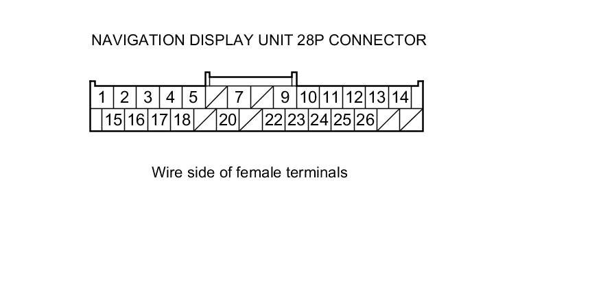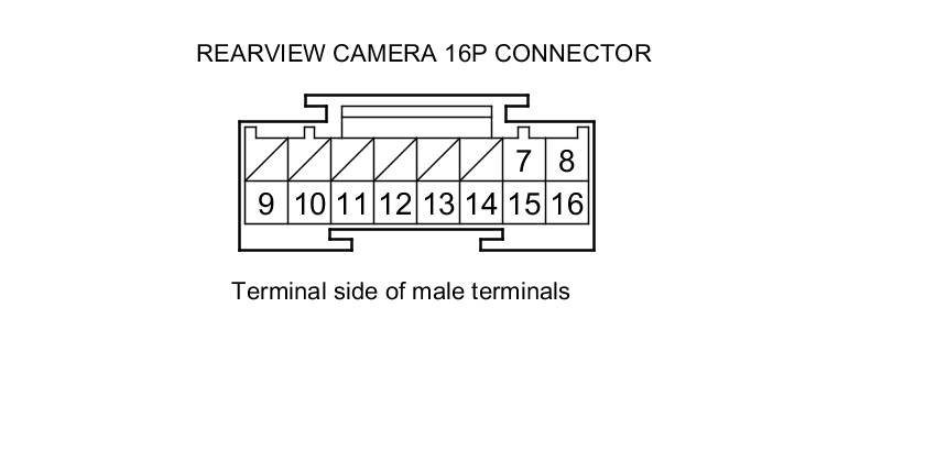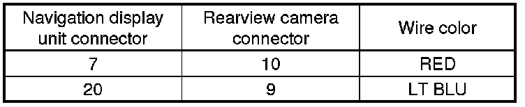 13. Check for continuity between the navigation display unit 28P connector and the rearview camera 16P connector according to the table.