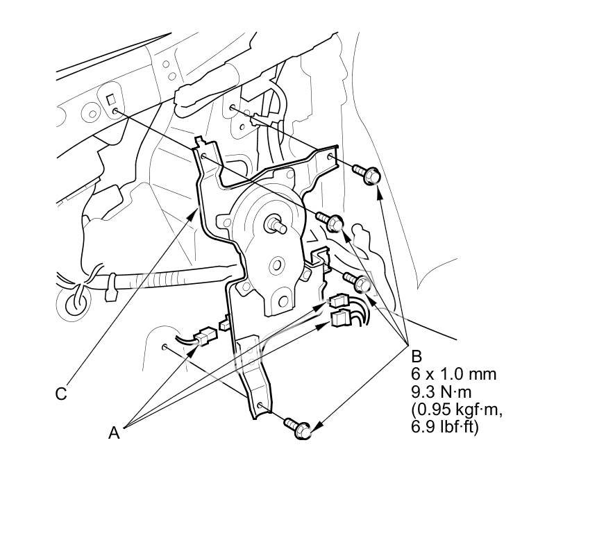 4. Disconnect the connectors (A), and remove the four bolts (B) and the drive unit (C).